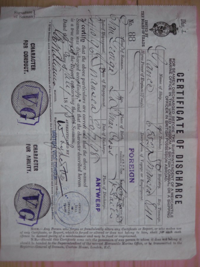Certificate of discharge from the barque 'Glance' after a voyage to Talcahuano (Chile)