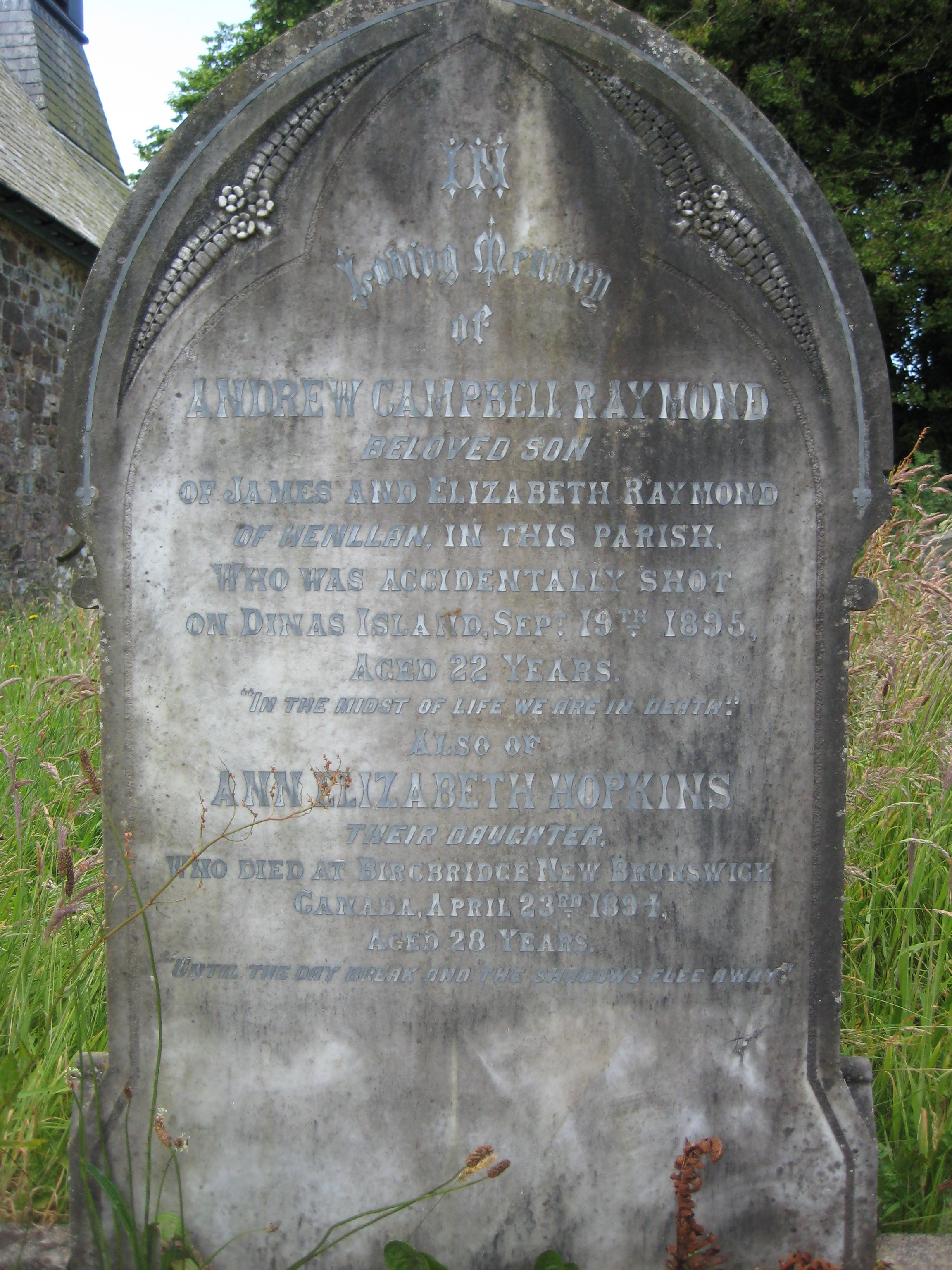 In loving memory of Andrew Campbell Raymond, beloved son of James and Elizabeth Raymond of Henllan in this parish, who was accidentally shot on Dinas Island, Sep: 19th 1895, aged 22 years. “In the midst of life we are in death.”