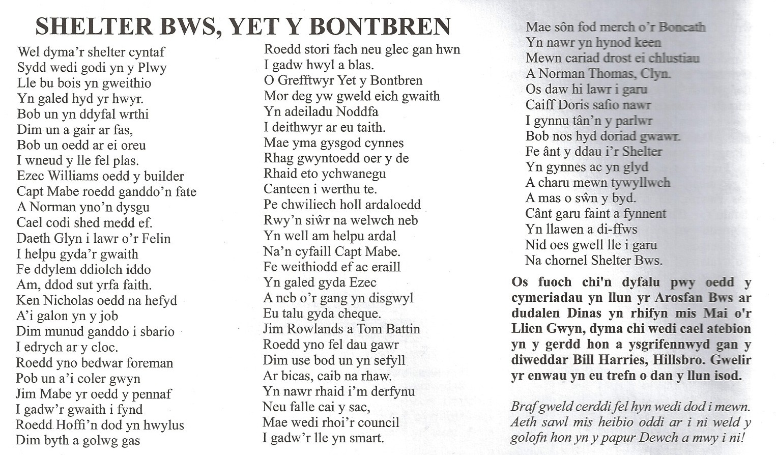 Well this is the first shelter /Built within the Parish /Where the boys were working/ Really hard until late. /Everyone working diligently /Not one cross word, /Each one doing his best /To make the place a mansion. /Ezec Williams was the builder/Capt Mabe worked as his mate /And Norman was there learning /How to build a shed says he. /Glyn came down from the Mill /To help with the work /We should really thank him /For coming such a long way. /Ken Nicholas was also there /With his heart in the job /Not a minute had he to spare /To look at the clock. /There were four foremen/ Everyone with a white collar /Jim Mabe was the foremost /To keep the work going /Hoffi came along cheerfully /Never with a stern glance /Always with a story or tale /To make the work fun. /Oh craftsmen of Yet y Bontpren /How fair your work appears /Building now a refuge /For travellers on their journey. /There is here a cosy shelter /From the cold southern winds /All that is now required /Is a canteen for selling tea. /If you searched throughout the districts /I’m sure you wouldn’t find /Anyone better for helping his community /Than our friend Capt Mabe. /He as well as others /Worked hard with Ezec /And none of the gang expected /To be paid with a cheque. /Jim Rowlands and Tom Battin /Were there like two giants /No chance for anyone to lean /On a pickaxe, mattock or shovel. /And now I must conclude /Or else I’ll face the sack /It’s now been given to the Council /To keep the place smart. /There’s a rumour that a girl from Boncath /Is now extremely keen /In love over her ears /With Norman Thomas, Clyn. /If she comes down to court him /Doris* can make savings now /No need for a fire in the parlour /Each night till break of dawn /The two’ll be in the Shelter /So cosy and so warm /Courting in the darkness /Away from the world’s noise /They’ll be courting as long as they want to /Happily and without fuss /There’s no better place for courting /Than the corner of a Bus Shelter.
