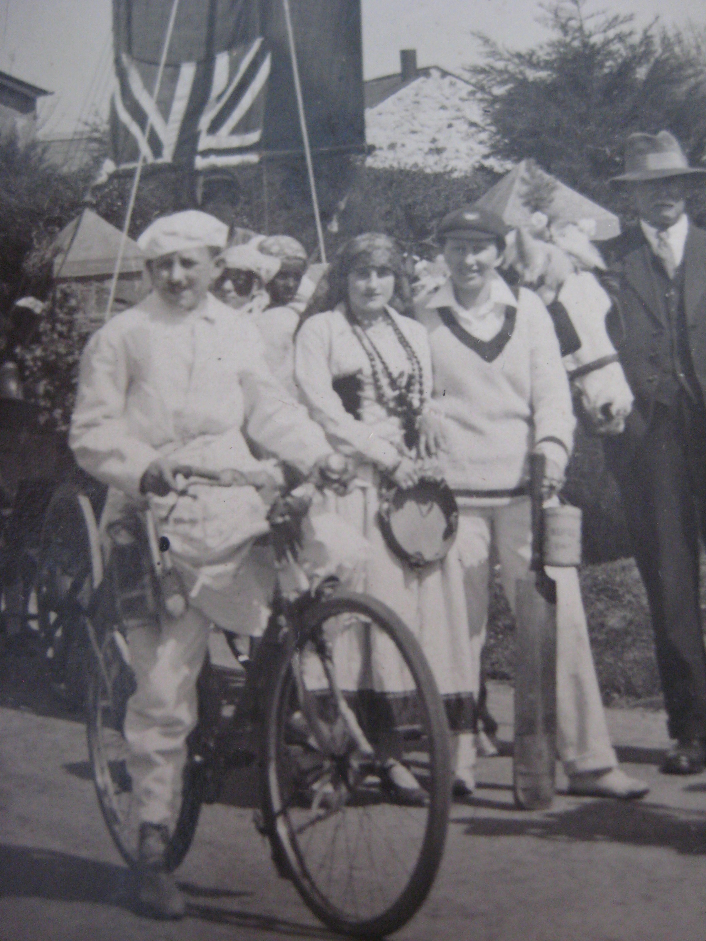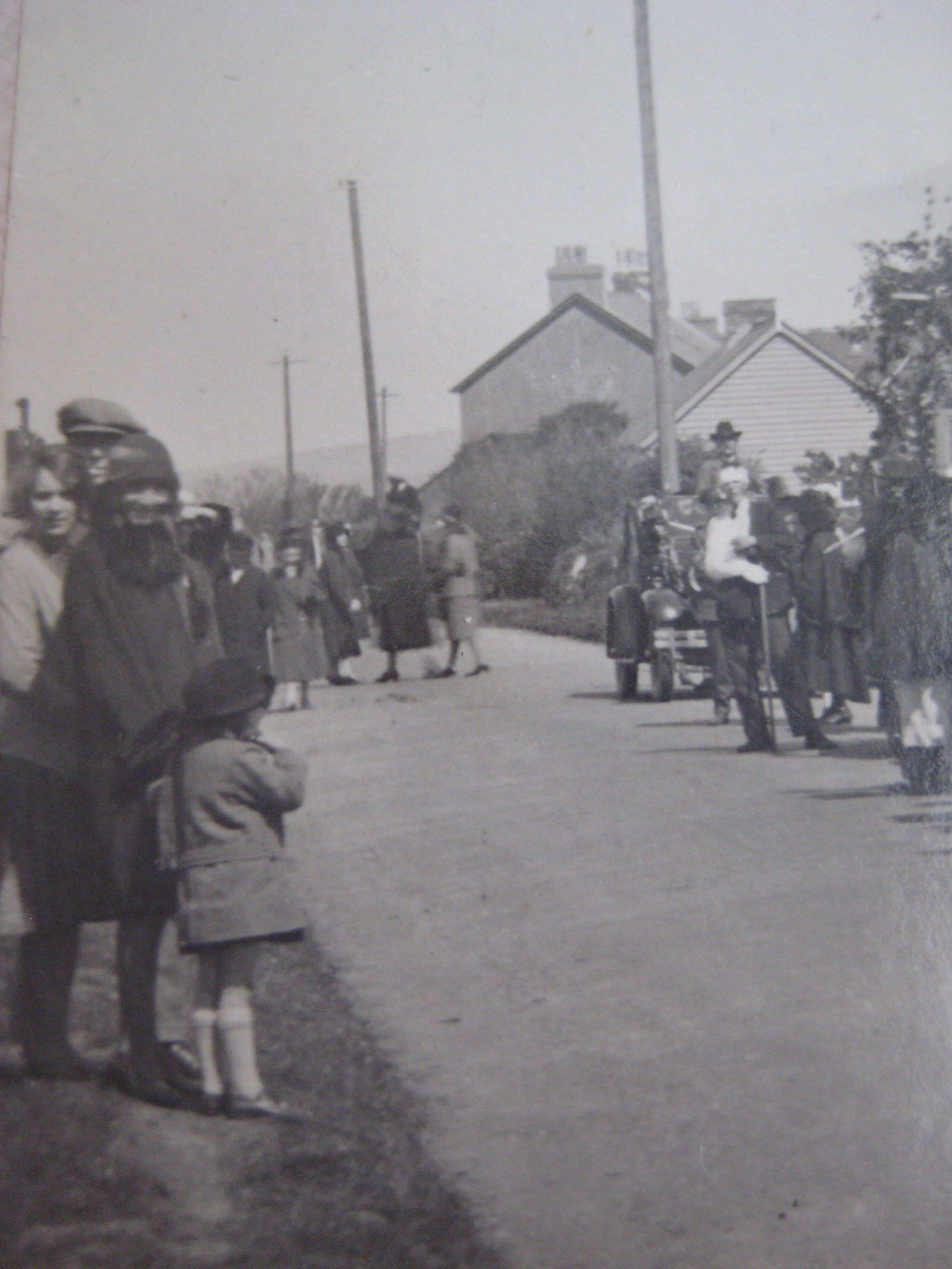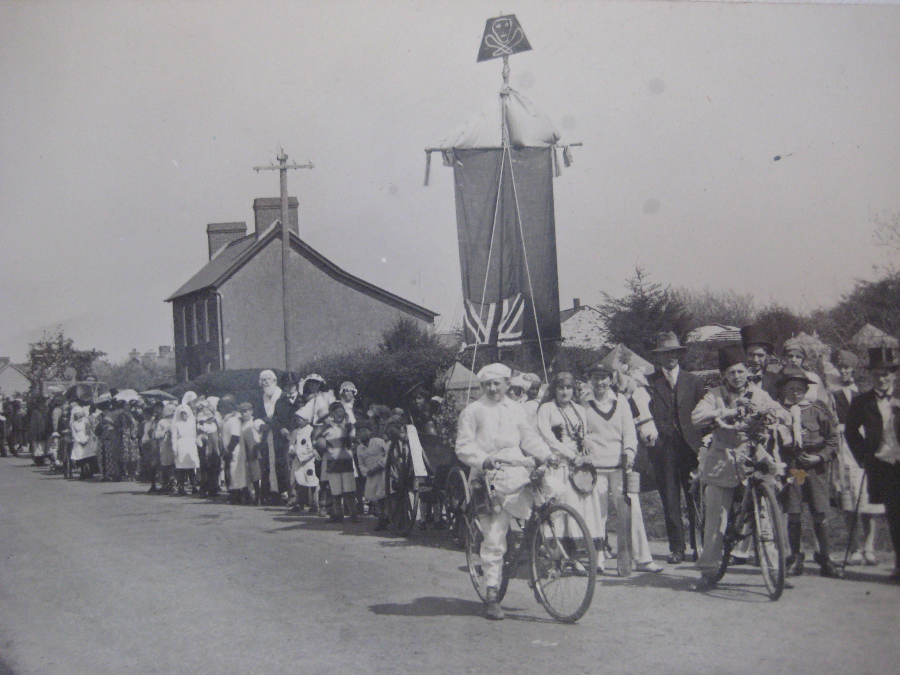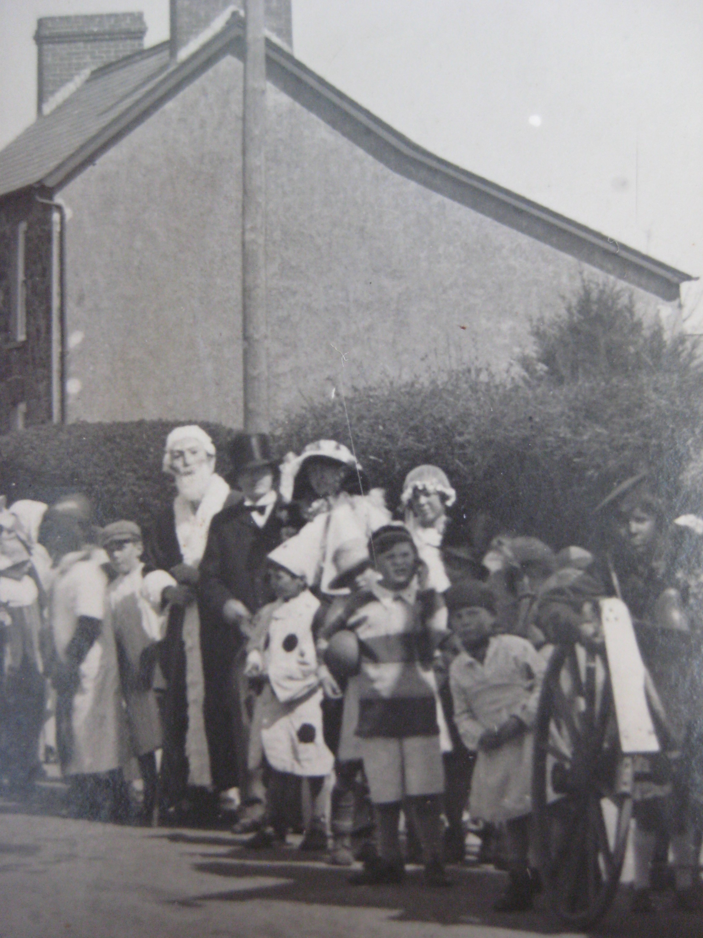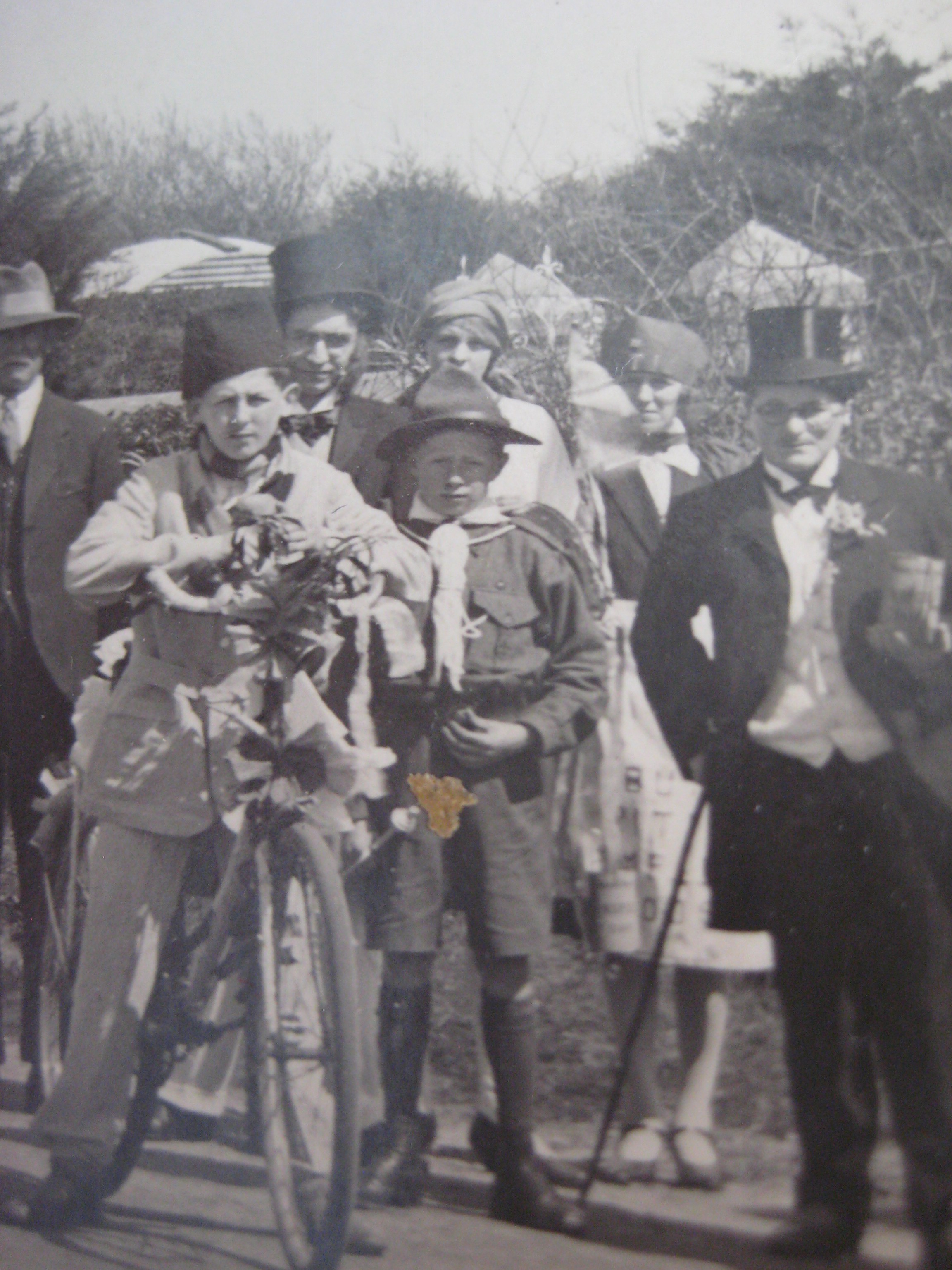 This photo survives from the early 1930s (pity about the nasty mark) and was probably taken at the time of Dinas’ Carnival at the beginning of August. I’d say that the person with the camera was a friend or relation of the Walters, because David George,wearing a fez and riding a bike, is there in the front – outshone only by the baker on the bike – and his sister, Esther, is just behind, standing to the left of the man with the glasses and the shiny black hat. The dressing-up is wonderful so here it is in more detail. If you can identify anyone in the photo, please let me know.