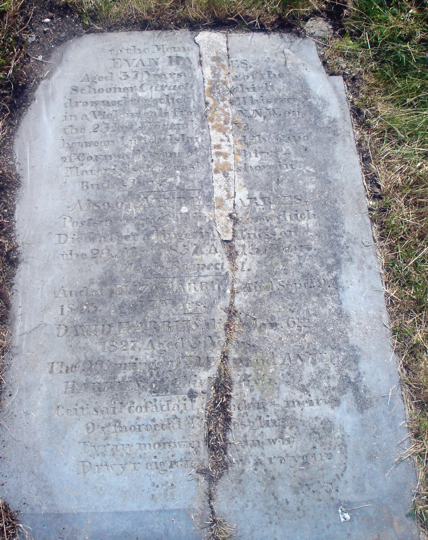 to the Memo_ _ EVAN HAR_ _ _ES. Aged 37 Years ¬_ _ _ _ er of the Schooner Caracta _ _ _ which drowned together w _ _ _ all his crew in a Violent gale fro _ _ _ _ N.N.W. on the 23d of Novemb_ _ _ _ 52 between Lundy Island _ _ _ the Cape of Cornwall, some of _ _ _ ship’s Materials were wash_ _ _shore in Bude’s bay __________________ Also of ALFRE_ _ARRIES. Post-master of Din_ _ _ross which Died after a lingerin_ _ llness on the 29. Novr 1857 A_ _d 31 Years Much Respect_d ____________________ And of ELIZA HARRIE_ died Septr 9. 1825 Aged 7 Years DAVID HARRIES die_ Jan 6th 1827 Aged 3 Years. The Offsprings of DAV_ D and ANNE. HARRIES of this _arish. Ceir sail cof a dail_ _ o d ir – meirw O’r moroedd fe _ _ _ esg_i_r Tyrau monwen_ _ _ yn wir Drwy’r eigion c_ _ _aw a rwygir J.J.