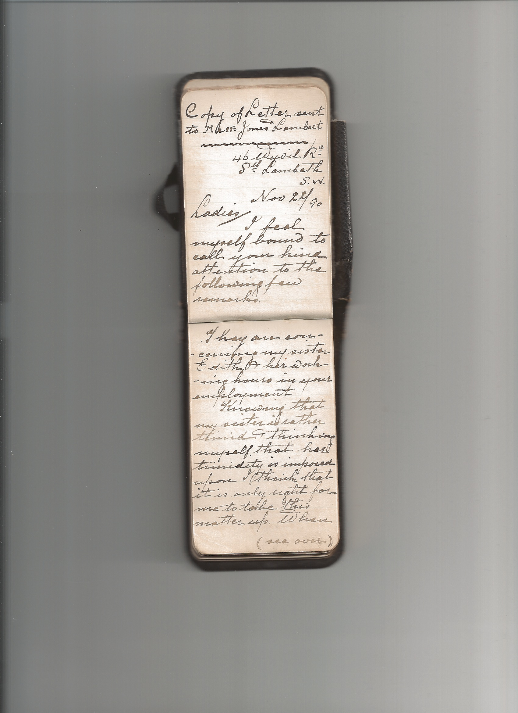 Ladies, I feel myself bound to call your kind attention to the following few remarks. They are concerning my sister Edith and her working hours in your employment. Knowing that my sister is rather timid and thinking myself that her timidity is imposed upon I think that it is only right for me to take this matter up. When