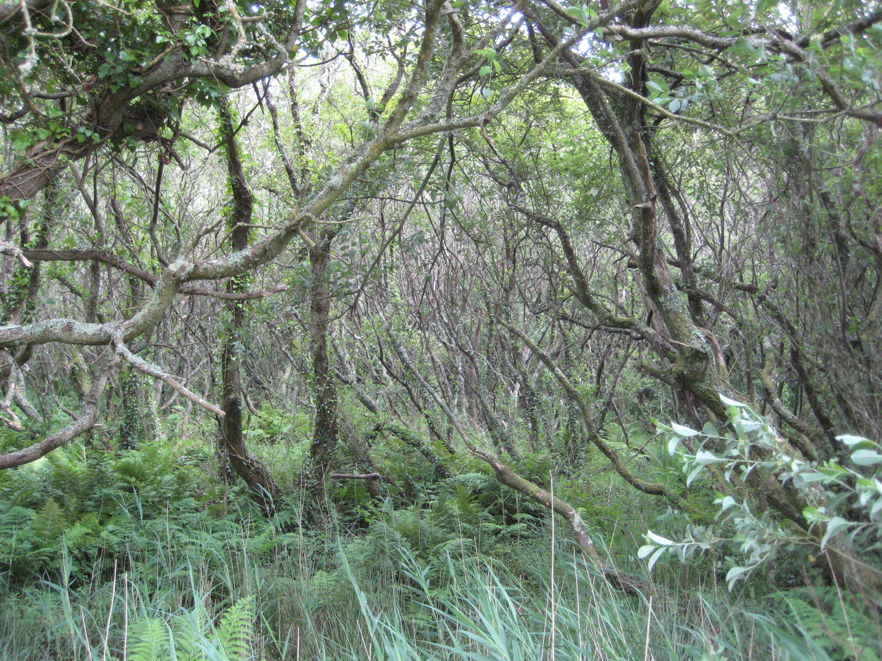 The meltwater channel that joins Cwm yr Egwlys to Pwllgwaelod is now a wild wood of willow and alder. In spite of the wide, wheelchair accessible path that follows the valley and offers coastal path walkers an easy shortcut across the neck that joins Dinas Head to the mainland, I find this a disturbing place. The valley bottom, to the side of the path, is a swamp where it’s not safe to venture and where, anyway, the trees grow too close together to allow even water-proofed walkers access.